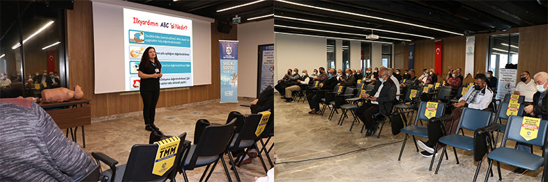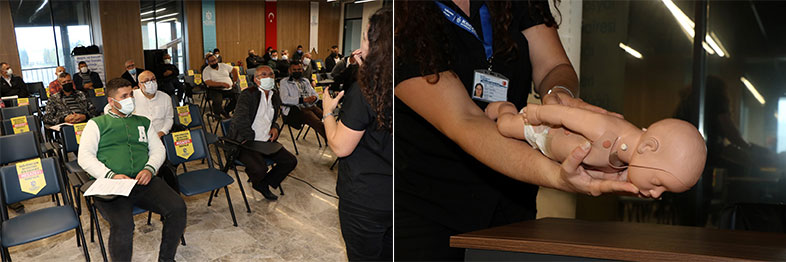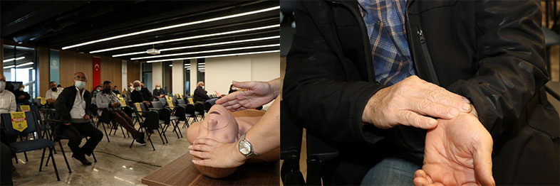 Sağlık ve Sosyal Hizmetler Dairesi Başkanlığı Sağlık İşleri Şube Müdürlüğü Eğitim birimi tarafından Kocaeli Kongre Merkezinde Covid -19 tedbirleri alınarak verilen eğitimlerde özellikle sağlık alanı ile ilgili acil durumlarda yapılması gerekenler eğitim hemşireler tarafından anlatıldı.