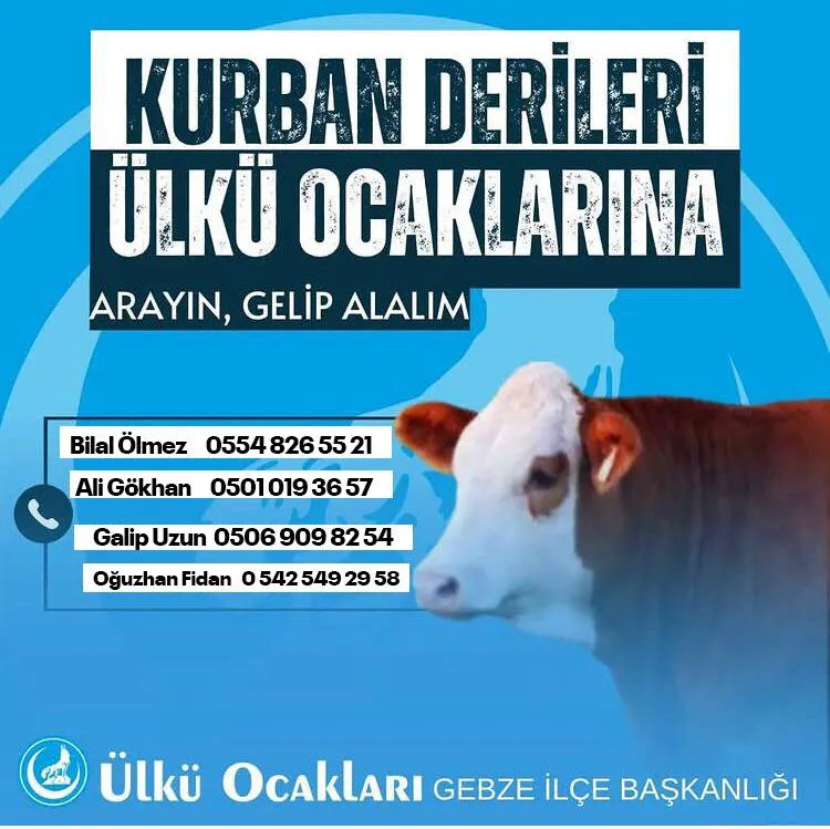 Kurban Bayramı’na sayılı günler kala, Gebze Ülkü Ocakları anlamlı bir çağrıyla kamuoyunun karşısına çıktı. "Sevabı Ocağınıza, Derisi Ocağımıza" sloganıyla başlatılan kampanyada vatandaşlardan, kestikleri kurbanların derilerini Gebze Ülkü Ocakları’na bağışlamaları istendi. Kampanyanın temel amacı; hem dini bir vecibenin bereketini paylaşmak hem de gençliğin milli ve manevi gelişimi için yürütülen faaliyetlere destek sağlamak.
