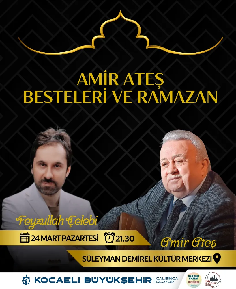 Kocaeli Büyükşehir Belediyesi, Ramazan ayının ruhunu ve manevi atmosferini yansıtacak özel bir müzik etkinliğine ev sahipliği yapacak. Bu bağlamda Büyükşehir, Kocaeli’nin yetiştirdiği en kıymetli değerlerden biri olan bestekâr Amir Ateş’in bestelerini Ramazan ayında Kocaelili musiki severlerle buluşturacak. “Amir Ateş Besteleri ve Ramazan” dinletisi 24 Mart Pazartesi akşamı gerçekleştirilecek. SDKM Büyük Sahne’de saat 21.30’da başlayacak dinletiye tüm vatandaşlar ücretsiz olarak katılabilecek. Gecede sevilen sanatçı Feyzullah Çelebi, üstat Amir Ateş’in sevilen eserlerini seslendirecek.