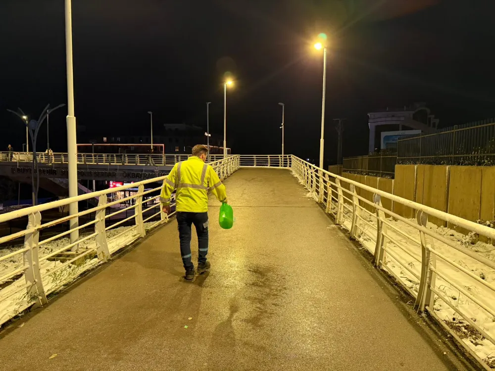 Büyükşehir Belediyesi'ne bağlı ekipler, özellikle vatandaşların yoğun olarak kullandığı durak önleri, üst geçitler, merdivenler ve hastane girişlerinde solüsyon ve tuzlama çalışmaları gerçekleştirdi. Gece boyunca devam eden çalışmalar, yeni yılın ilk saatlerinde de kesintisiz şekilde sürdürüldü.