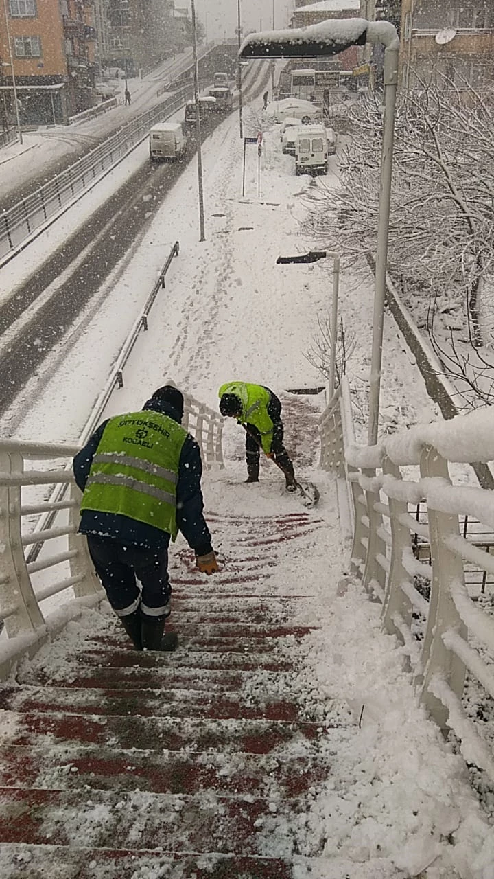 Kocaeli’de etkisini gösteren yoğun kar yağışı ile birlikte sahaya inen Büyükşehir Belediyesi ekipleri, 12 ilçede özverili bir çalışma yürütüyor. Araç ve yaya trafiğinin yoğun olduğu cadde ve sokaklarda yoğun bir çalışma içerisine giren Büyükşehir, vatandaşların rahat ve huzurlu bir kış dönemi geçirmesini amaçlıyor. Sabahın ilk saatlerinde kent merkezinde yaya yoğunluğu yaşanan caddelerde kaldırım tuzlama ve kar küremesi çalışmaları gerçekleştiren karla mücadele ekipleri, yaya kaldırımlarını da yayalar için güvenli hale getiriyor.