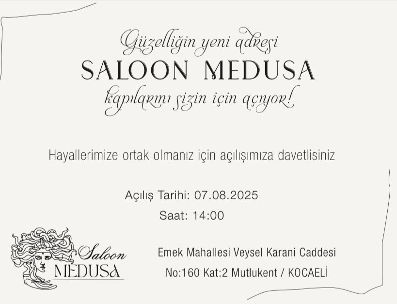 7 Ağustos 2025 Perşembe günü saat 14:00' da Emek Mahallesi Veyel Karani Caddesi No:160 Kat:2 Mutlukent adresine açılacak olan Salon Medusa Güzellik, Kozmetik, Bakım eve bir çok konuda hizmet vermeye başlayacak.