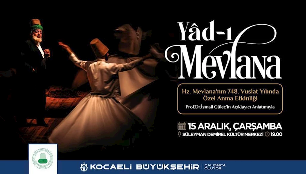 Kocaeli Büyükşehir Belediyesi, Mevlana Celaleddin-i Rumi’nin vuslatının 748. yıldönümünde özel bir anma etkinliği düzenleyecek. “Yad-ı Mevlana”(Sema Mukabelesi) özel anma etkinliği Uluslararası Mevlana Vakfı ile 15 Aralık Çarşamba akşamı ortaklaşa düzenlenecek. SDKM Büyük Sahnede gerçekleştirilecek olan özel etkinlik 19.00’da başlayacak.