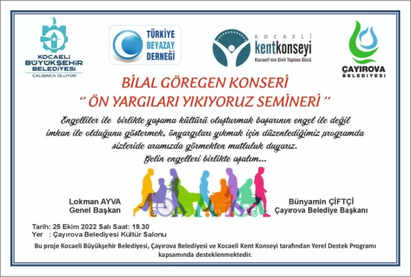 Duyarlıyım, bende engelliler ile ilgili çalışmalara katkı sunmak istiyorum, diyen herkesi Salı akşamı yapacağımız ön yargıları yıkıyoruz semine davet ediyorum. Bilal göregenin konseri ile renklenecek programda bölgemizin sevilen ismi, tüm önyargıları yıkmış engeline rağmen bölgesine ve milletine katma değer üreten değerli Yönetim kurulu üyemiz Hakan Höbek, Türkiye sakatlar konfedarasyonu genel sekreteri  Ayhan Metin, Beyazay genel başkanımız Lokman ayva, ve sürpriz isimler katılacak. Kimselere söz vermeyin, Salı akşamı davetlimizsiniz dedi.
