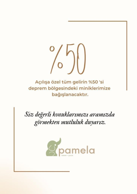 Gebze Hacıhalil mahallesi, Atatürk caddesinde açılan PAMELA Bebek Çocuk Giyim mağazası hizmet kalitesi ve sürdürülebilir ticaret ahlakı ile fark yaratmayı hedefliyor. Birbirinden seçkin çok geniş ürün yelpazesi, kaliteli ve ekonomik hizmet anlayışı, 0-14 yaş aralığında ki ürün gamı ile giyim tekstiline yeni soluk olmayı hedeflediklerini belirten iş kadını Şennur Demir, “ Türkiye'nin en seçkin markalarının geniş kereaksiyonlarını en uygun fiyatlarla Gebzeli tüketicilerle buluşturuyoruz. 20 Mayıs Cumartesi günü saat 12.30'da gerçekleşecek açılışımızın gelirinin yüzde 50'sini yarısını 6 şubatta hepimizi yasa boğan depremin yaralarının sarılması için bağışlama kararı aldık.” dedi.