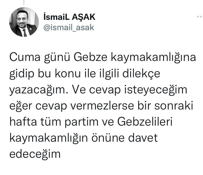 Sosyal medya hesaplarından açıklama yapan Memleket Partisi Gebze İlçe Başkanı İsmail Aşak şunları söyledi: