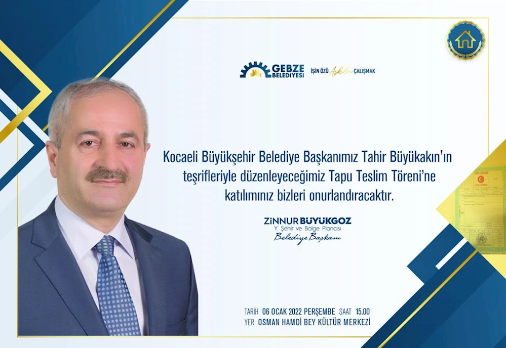 Gebze Belediye Başkanı Zinnur Büyükgöz’ün ev sahipliğinde, Kocaeli Büyükşehir Belediye Başkanı Tahir Büyükakın’ın teşrifleriyle düzenlenecek Tapu Teslim Töreni’ne basınımızın tüm güzide temsilcileri davetlidir.