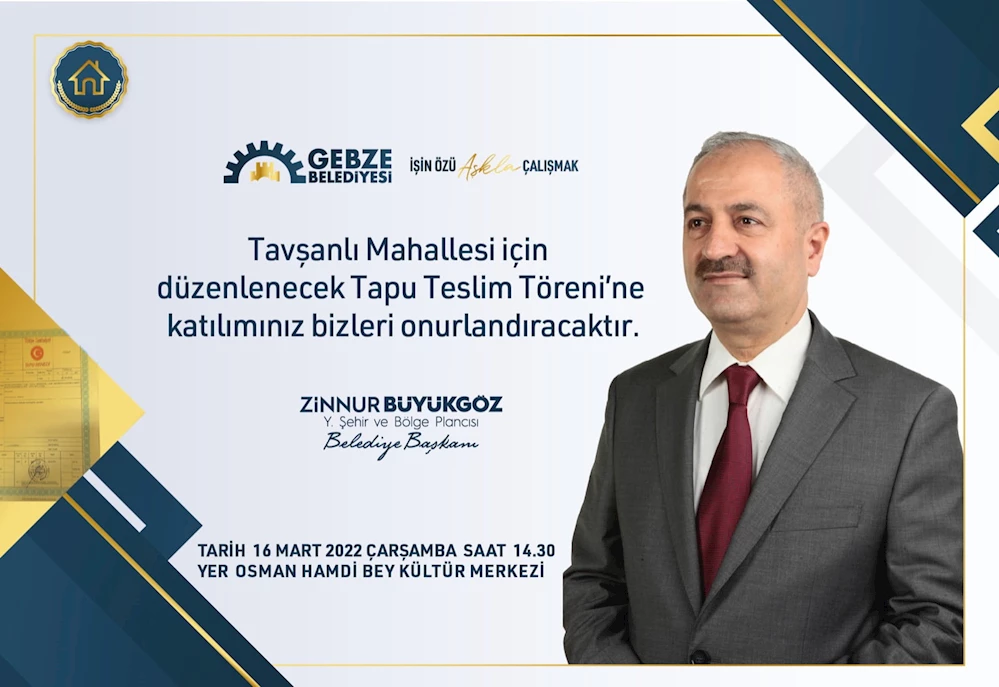 Gebze Belediyesi 16 Mart Çarşamba Günü (Yarın) Saat 14:30'da Osman Hamdi Bey Kültür Merkezinde Tavşanlı Mahallesi tapu teslim töreni düzenlenecek.
